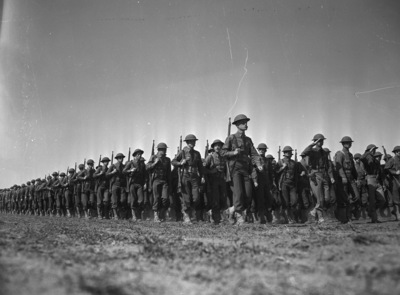 Civilians are flocking to Camp Bowie in Brownwood, Texas for the Army Day celebration. Men of the 36th Division are demonstrating their military perfection as they pass on parade at the camp. The men are dressed in helmets, military uniforms and have their rifles slung over their shoulders. Published in Fort Worth Star-Telegram, evening edition, April 8, 1941.