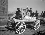 Starting at front row, left to right: Mrs. G. E. Harlan, Mrs. J. L. Weatherford, Mrs. W. M. Jackson, Mrs. L. A. Pearce, Mrs. Carrie Hollar, Mrs. A. J. Cantrell, Mrs. H. Lanham and Mrs. Charles Nunnally. The women are sitting in a large carriage that has a sign on the side that reads, "Belles of 1891." The carriage is made up of four large, wooden wheels and a long sitting area. Each of the women are wearing large coats, a variety of hats, long skirts or dresses. Behind them another carriage can be seen close by. The carriage was part of a larger parade that rode through the city during the Borden County 50th anniversary celebration. The theme of the parade was "the 1890's," when Borden County was founded.