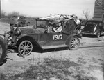 One the cars in the parade at the Borden County 50th anniversary celebration. The car and its passengers are arranged to resemble a typical West Texas family in 1913. The style of automobile shown was the first car in the county. A family of nine are crammed in the car. One of the children is standing up in the car and holding onto the front window. The year "1913" is written on the side of the car. The back of the car holds more children, with a couple of boys poking out from the back seats and hanging on.