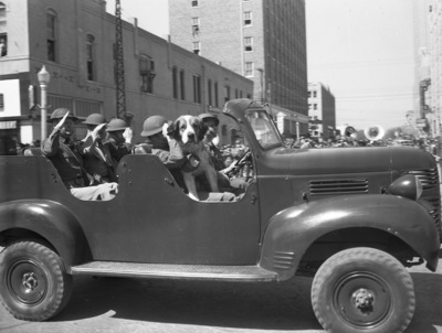 Trucks; Automobiles; Dogs; Mascots; Military personnel; Military uniforms; Camp Barkeley; Parades & processions; Armed Forces Day