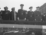 Standing at the reviewing stand for Camp Barkeley's Army Day parade at Abilene, Texas, were, left to right, Mayor W. W. Hair, of Abilene, Texas, Mrs. Antonio Barkeley, guest of honor, Major General W. S. Key, 45th Division commander, First Lieutenant Harold Johnston, who received the Congressional Medal of Honor while on the same mission on which David Barkeley lost his life in World War I, and Brigadier General H. H. Richardson, adjutant general of Colorado. Mayor Hair is wearing a suit. Mrs. Barkeley is wearing a dress with a floral corsage pinned to it, a fur coat and a hat. The three military officers are wearing their uniforms. Standing behind the group at the reviewing stand are more spectators of the show.
