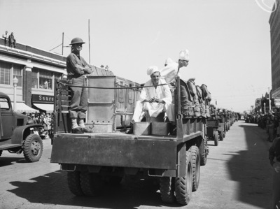 Mobile kitchens rolled through the streets of Abilene, Texas, when the 45th Division of Camp Barkeley observed Army Day. Cooks on the mobile kitchens tossed fresh doughnuts to the thousands of parade spectators who lined the streets. On the mobile unit is a man dressed in a military uniform and two men wearing chef coats, aprons and chef hats. Some people are sitting on store rooftops, watching the parade.