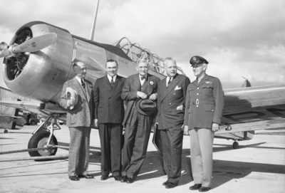 Left to right, Amon Carter, W. Lee O' Daniel, William S. Kundsen, J. H. Kindelberger, and General George H. Brett.