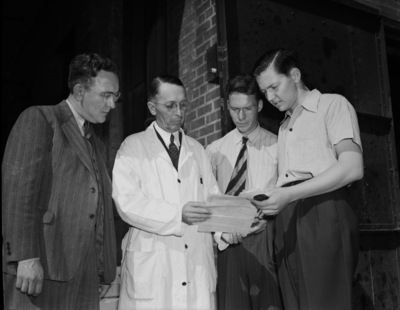 W. C. Moore, chief chemist at Armour and Company, is explaining a chemical problem to these students and instructor of Texas Technological College who visited the plant. The students are on an inspection tour of industries in the Fort Worth, Texas, area, sponsored by the Student Chapter of the American Institute of Chemical Engineering at the college. Standing left to right are A. G. Oberg (faculty sponsor), W. C. Moore, Walter Studebaker, of Lubbock, Texas, secretary of the student organization, and Evatt Horne, of Cisco, Texas, president of the organization. Mr. Oberg is wearing a suit, Mr. Moore is wearing a lab coat and the two students are wearing trousers and collared shirts. Mr. Moore is holding a piece of paper. Behind them is a doorway and a brick wall.
