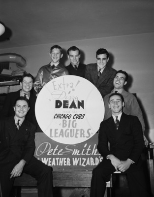 Golden Gloves boxers (left to right) Herman Choate, Charles Kendrick, Leonard Stanford, Leonard Leudtke, J. V. Nasche and C. R. Jordan. The boxers surround a sign reading "Extra! Dizzy Dean and the Chicago Cubs Big Leaguers [and] Pete Smith's Weather Wizards." The men are all smiling. Some are wearing suits and ties while others are wearing jackets and ties.