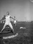 A. C. Odell, 200-pound football center at Texas Christian University (T. C. U.), shown winning the shot put in the freshman event at the T. C. U.-Baylor University track meet. Mr. Odell is standing with his legs spread apart and holding a shot put in his right hand, about to throw. He is wearing a tank top and a pair of shorts. On the ground in front of him is a short, curved barrier. Behind him is an unnamed athlete who is shirtless and looking on. In the background, far left, are spectators watching another event at the meet.