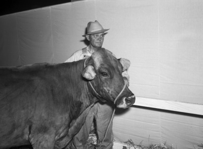 The Brown Swiss cattle breed was shown in Fort Worth, Texas, for the first time at the Dairy Cattle Exhibit at Will Rogers Memorial Coliseum. One of the specimens of the breed is pictured with its owner, H. L. Tooker of Ballinger, Texas. The exhibition is the first Texas show presented exclusively of milk cow herds. Mr. Tooker is wearing eyeglasses and a hat.