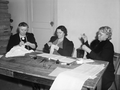 Left to right are Mrs. M. A. Elliott, 1616 Carleton Avenue, Fort Worth, Texas, election judge, Mrs. P. L. Forbes, 4613 Washburn Avenue, Fort Worth, Texas, and Mrs. P. F. Middleton, 4700 Birchman Avenue, Fort Worth, Texas. All three women are sitting at a table, sewing. On the table are ink bottles, pens, pencils, sheets of paper and sewing equipment. Mrs. Elliott is crocheting while the other two darn socks. There is a closed door behind them. All the women are wearing coats and dresses and Mrs. Forbes and Mrs. Middleton are wearing eyeglasses. These women election officials at the fire hall box volunteered to darn the firemen at Station 18's socks for them after a City Council election.