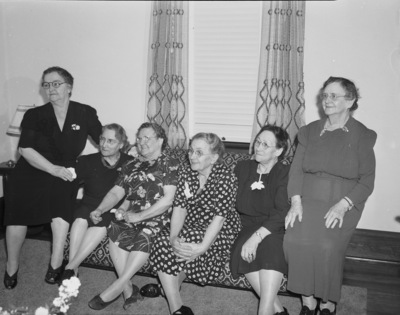 Mrs. J. F. Blinn, of Chicago, Illinois, and four Fort Worth, Texas, women, all of whom were members of the Broadway Baptist Church 50 years ago as girls, were honored by Mrs. Mary E. Pate at a lumcheon given at the home of Mrs. Pate's daughter, Mrs. Don Vestal. Seated on a couch, left to right, are Mrs. Maggie Young, Mrs. Martha Van Zandt, Mrs. J. F. Blinn, Mrs. Mary E. Pate, Mrs. C. R. Keith, and Mrs. R. P. White. Mrs. Young and Mrs. White are sitting on the armrests of the couch. Behind them is a window with the curtains pulled aside. Mrs. Young is wearing a dark dress and eyeglasses. Mrs. Van Zandt is wearing a dark dress, necklace and eyeglasses. Mrs. Blinn and Mrs. Pate are wearing floral print dresses and eyeglasses. Mrs. Keith and Mrs. White are wearing long-sleeve dresses and eyeglasses.
