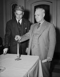 Scottish Rite Club of Fort Worth. C. L. Sharp, past president of the Club, shown lighting a candle while Charles H. Kahn, president watches. The Maundy Thursday event at Hotel Texas was in memory of six Club members who died in the last 12 months. This photograph was published in the April 11, 1941 morning edition of the Star-Telegram.