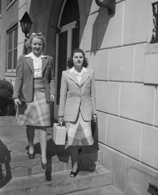 Mary Belle Polley of Beckley, West Virginia, left, and Jane Hurley, daughter of Mr. and Mrs. H. B. Hurley, 2306 Park Place. The girls, roommates at Lindenwood College, St. Charles, Missouri, are spending their Easter vacation visiting Mr. and Mrs. Hurley. They were photographed as they left for College Station, Texas, to attend Easter dances of the Ross Volunteers of The Agricultural and Mechanical College of Texas (Texas A & M). They are walking down steps outside of a building, and are both wearing a blouse, skirt and blazer. Miss Hurley is holding a briefcase in one hand and a purse in the other. Miss Polley is holding a pouch in one hand.