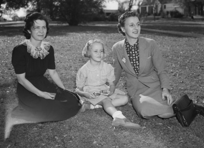 Mrs. George Orm, 1310 Belle Place, left, and her guests from Rio De Janerio, Brazil, Mrs. H. V. Shelby and her daughter, Joan Shelby. Mrs. Shelby, on her second visit to Fort Worth, Texas, is a sister-in-law of Mrs. Orm. They are sitting outside in the grass. Mrs. Orm is wearing an empire-waist dress with a netted embellishment on the neckline and Mrs. Shelby is wearing a flower-print blouse, a skirt and a blazer. Joan is wearing a dress and is holding photographs. There is a purse on the grass to the right of Mrs. Shelby.