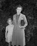 Mrs. H. V. Shelby, right, and her daughter Joan Shelby visiting Fort Worth, Texas, from Rio De Janerio, Brazil. They are guests of Mrs. George Orm, Mrs. Shelby's sister-in-law. They are standing outside in front of a tall bush. Mrs. Shelby is wearing a printed blouse, skirt and a blazer with a brooch on the lapel. She is holding a purse in her left hand. Joan is wearing a dress.