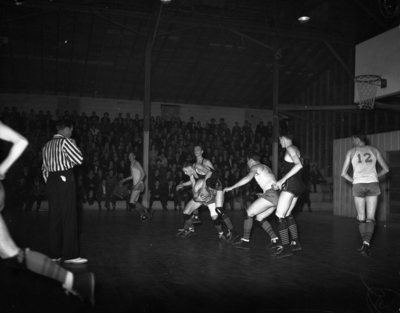 The Polytechnic High School and Riverside High School basketball teams faced off Wednesday night at Texas Christian University. J. R. Andrews of the Eagles is holding onto the ball, but is being tied up by Poly's long-armed Carl Lohrke. Behind the fight for the ball is Joe Dawson of Poly. J. C. Parkman, Riverside is coming from the right. Poly went on to win the game 23-14.