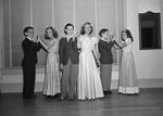 The "Boomps-a-Daisy" will be performed by these pupils of the Butcher School of Dancing at the Girls' Service League's annual charity ball at Hotel Texas. Rehearsing, left to right, are A. T. Lowery and Roberta Andrews, Jimmy Foster and Betty Dean Jenkins, and Paxton Moore and Kateva White. The couples on the left and right are facing each other and holding their palms together. The center couple, Jimmy Foster and Betty Dean Jenkins, are standing slightly ahead, facing straight on and holding hands. The three couples are standing in front of a window whose blinds are shut. There is a mirror to the right of the window on the back wall. The girls are wearing ball gowns. A. T. Lowery is wearing suit and Jimmy Foster and Paxton Moore are wearing shirts, trousers and blazers.
