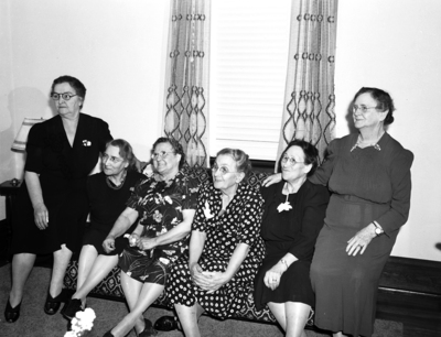 Image shows Mrs. J. F. Blinn, of Chicago, Illinois, and four Fort Worth, Texas, women, all of whom were members of the Broadway Baptist Church 50 years ago as girls, were honored by Mrs. Mary E. Pate at a luncheon given at the home of Mrs. Pate's daughter, Mrs. Don Vestal. Seated on a couch, left to right, are Mrs. Maggie Young, Mrs. Martha Van Zandt, Mrs. J. F. Blinn, Mrs. Mary E. Pate, Mrs. C. R. Keith, and Mrs. R. P. White. Mrs. Young and Mrs. White are sitting on the armrests of the couch. Behind them is a window with the curtains pulled aside. Mrs. Young is wearing a dark dress and eyeglasses. Mrs. Van Zandt is wearing a dark dress, necklace and eyeglasses. Mrs. Blinn and Mrs. Pate are wearing floral print dresses and eyeglasses. Mrs. Keith and Mrs. White are wearing long-sleeve dresses and eyeglasses. Published in the Fort Worth Star-Telegram morning edition April 13, 1941.