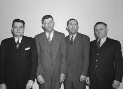 New officers of the South Fort Worth, Texas, Civic League are, left to right, President Clyde Thomas, Vice President Steve Ewing, Vice President J. W. Wallace and Secretary-treasurer O. D. Monroe. All men are standing front of a wall, wearing suits. Mr. Ewing, Mr. Wallace and Mr. Monroe are wearing eyeglasses.