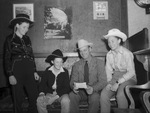 Three sisters from Jacksboro, Texas are breaking into a predominately masculine field by selling cattle in Fort Worth, Texas. Harry Fifer is calculating the figures on the sale. The sisters are left to right, Mary Alice, Jackie, and Ada Worthington. They are the daughters of Mr. and Mrs. L. A. Worthington. Mary Alice is wearing a dark cowboy hat with a striped brim, satin blouse, and trousers. Jackie is dressed in a dark cowboy hat with a striped brim, a collared shirt, sweater, and trousers. Mr. Fifer is wearing a hat and a suit with a checkered sports coat. Ada is dressed in a cowboy hat, button-up blouse and trousers. There are pictures hanging on the wall, above the bench.