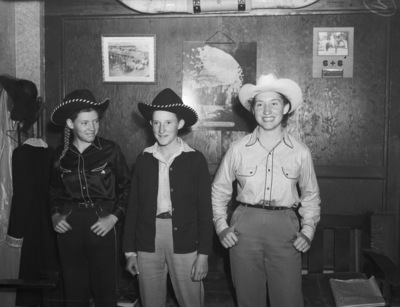 Three sisters from Jacksboro, Texas are breaking into a predominately masculine field by selling cattle in Fort Worth, Texas. The sisters are left to right, Mary Alice, Jackie, and Ada Worthington. They are the daughters of Mr. and Mrs. L. A. Worthington. Mary Alice is wearing a dark cowboy hat with a striped brim, satin blouse, and trousers. Jackie is dressed in a dark cowboy hat with a striped brim, a collared shirt, sweater, and trousers. Ada is dressed in a cowboy hat, button-up blouse and trousers. There are pictures hanging on the wall, above the bench.