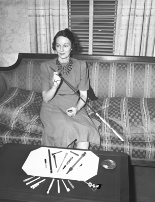 Mrs. Charles H. Osmond, showing her collection of cigarette holders. Mrs. Osmond is wearing a dress and sitting on a couch. She is holding her longest cigarette holder in her hand while a number of smaller holders are laid out on a table in front of her. Published in the Fort Worth Star-Telegram Morning Edition, April 12 1941.