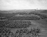 Easter religious services held at Camp Bowie, Brownwood, Texas; part of 36th Division hears Chaplain Dan A. Laning of 133rd Field Artillery deliver sermon, 04/13/1941. Troops are seating on the grass in rows, listening.