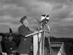 Easter religious services held at Camp Bowie, Brownwood, Texas; Chaplain Dan A. Laning of 133rd Field Artillery delivers sermon, 04/13/1941. Laning is standing at a podium facing the crowd.