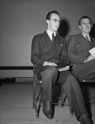 Camp Wolters is observing Easter with a sunrise service, which is being held in the theater due to the drizzling rain. Reverend Charles Wilson is reading the Scripture for the service. He is sitting on a chair with his Bible on his lap. He dressed in a double breasted pinstripe suit. Sitting next to Reverend Wilson is Reverend Bryan Keathley, who said the opening prayer. Published in Fort Worth Star-Telegram, morning edition, April 14, 1941.