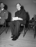 Camp Wolters is observing Easter with a sunrise service, which is being held in the theater due to the drizzling rain. Reverend Dillon Morgan is giving the benediction. He is sitting on a chair, dressed in his clerical clothing. On the left edge of the picture is Reverend E. H. Lightfoot, who presided. Published in Fort Worth Star-Telegram, morning edition, April 14, 1941.