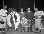 At the plate before the Fort Worth Cats versus Dallas Rebel game at LaGrave Field, participating in the opening day ceremony, were, left to right, Manager Bob Linton of the Cats, President George Schepps of the Rebels, Clarence Kraft, chairman of Fort Worth, Texas' opening day booster committee, and Manager Wally Dashiell of the Rebels. The four men are holding large bouquets of flowers and a standing next to a floral wreath display. Linton and Dashiell are both wearing baseball uniforms for their respective teams, while Schepps and Kraft are wearing double-breasted suits. Kraft is also wearing a pair of eyeglasses and is holding his hat in his left hand.