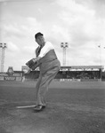 Fort Worth, Texas, Mayor I. N. McCrary delivering the first pitch at a Fort Worth Cats versus Dallas Rebels game at LaGrave Field. Mayor McCrary is standing on the pitcher's mound, readying his throw by pulling his hand back and getting in position. He is holding a baseball in his right hand. He is wearing a collared shirt, a suit vest and a pair of trousers. He is also wearing a dark baseball cap and a baseball glove on his left hand and is smoking a cigar.