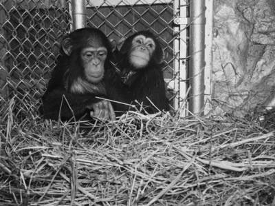 The Forest Park Zoo's two young chimpanzees are lounging in their new home after a four day trip here from New York City, New York. The chimps have their backs against the chain-link fence and are sitting in a stack of hay. The chimp on the right appears to be smiling for the photograph.
