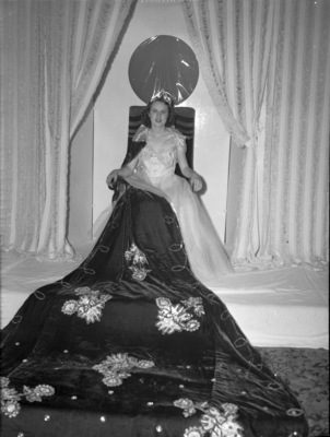 Our Lady of Victory Camp Easter Dance Queen. Miss Jacqueline Hamilton, queen of Our Lady of Victory Camp Royal Easter Dance, shown in her regal attire, as she sits on her throne in Hotel Texas.
