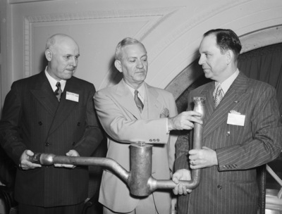 Examining a plumbing pipe are, left to right, F. C. Hansen, of Tulsa, Oklahoma, president of the Associated Master Plumbers of Oklahoma; R. K. Landreth, of Longview, Texas, president of the Associated Master Plumbers of Texas, and O. J. Butts, of Fort Worth, Texas, president of the Fort Worth Master Plumbers Association. They are attending the annual convention of the Texas association at Hotel Texas. They are standing in a room, wearing suits, each holding on to a section of the pipe.