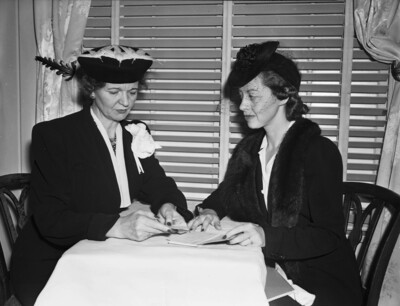 Mrs. Sheldon Wilson (left), general chairman of the annual Bluebonnet luncheon of the Business and Professional Women's Club, and Miss Lola Reece, ticket chairman, are making plans for the luncheon which will be open to the public in the Crystal Ballroom of Hotel Texas. The two women are sitting at a small table in front of a window. Mrs. Wilson is wearing a long coat that has a flower accessory pinned to it and a decorated hat. Miss Reece is wearing a coat with fur detailing and a hat with lace embellishments. Mrs. Wilson is looking at a notebook that Miss Reece is holding.