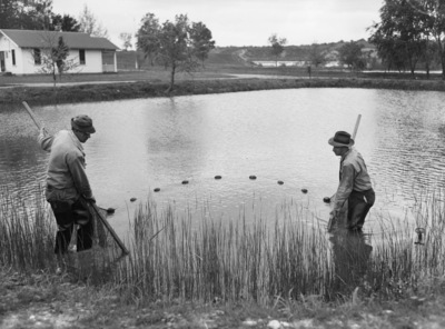 Open House at the Federal Fish Hatchery on Lake Worth, Texas. Foreman A. L. Carlton, left, and George Taylor seining for fingerling fish in one of the ponds. Each man stands at one end of the net which they are slowly bringing out of the water. Behind the pond is a dirt road and a small house. This photograph was published in the April 15, 1941 morning edition of the Star-Press