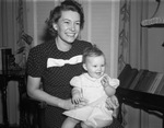 Mrs. Karl E. Pleger is holding her daughter, Penelope, who is sitting on her lap from Rochester, New York. They are guests with Dr. Pleger of her parents, Mr. and Mrs. B. C. Reich Jr, on Mistletoe Boulevard. The Plegers will leave Monday morning to return to their home in Rochester, New York. Mrs. Pleger is the former Miss Brunhilde Reich. Mrs. Pleger is wearing a dark dress with small, light colored polka dots and large bow across the chest, and ring on her right and left ring finger. Baby Penelope is wearing a light colored dress with small embroidered flowers along the front chest area and hem of the bottom of the collared dress, socks and shoes. In the background a book trough book case filled with hard cover books is on the right side of the family. On the left, in the background, a thin table with books and sculpted book end can be seen. A window covers by slated closed blinds and open curtains is directly behind the family. Published in the Fort Worth Star-Telegram morning edition, April 18, 1941.
