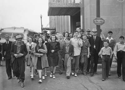 Part of the sightseeing group of school children from McLennan and Hill Counties, Texas, who visited Fort Worth, Texas, on one of a series of "Know Texas Better" educational tours. The group from Mart, Texas, is shown leaving the Texas and Pacific Station for one of the 11 chartered buses in which they toured the city. At the far right, wearing a suit, necktie and hat, is J. J. Youngblood, Mart School superintendent, who headed the party. The group is shown crossing the road from the station. There is a bus behind them.
