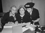 Members of the registration committee for the annual meeting of the Women's Auxiliary of the Fort Worth Presbytery, United States, which opened at First Presbyterian Church, Fort Worth, Texas. Left to right, they are Mrs. John McBride, chairman; Mrs. C. E. Robinson and Mrs. J. R. Nunnelley. They are sitting at a desk. On the desk are notepads, a pair of eyeglasses, paper, boxes and a typewriter. Mrs. Robinson and Mrs. Nunnelley are wearing hats.