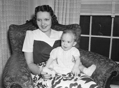 Mrs. W. P. Irving and her son, Billy, of Tyler, Texas, who are visiting her parents, Dr. and Mrs. I. M. Cochran, 2220 Aster Street. Billy is the fifth living generation of the family. His mother is the former Miss Berna Cochran. She is sitting on a sofa, with Billy on her lap. She is wearing a blouse and a skirt. There is a window with curtains in the background.