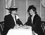 Image shows Mrs. Sheldon Wilson (left), general chairman of the annual Bluebonnet luncheon of the Business and Professional Women's Club, and Miss Lola Reece, ticket chairman, are making plans for the luncheon which will be open to the public in the Crystal Ballroom of Hotel Texas. The two women are sitting at a small table in front of a window. Mrs. Wilson is wearing a long coat that has a flower accessory pinned to it and a decorated hat. Miss Reece is wearing a coat with fur detailing and a hat with lace embellishments. Mrs. Wilson is looking at a notebook that Miss Reece is holding. Published in the Fort Worth Star-Telegram morning edition April 18, 1941.