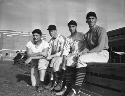 Left to right, Coach Durward Horner, Thomas Orr, Howard Raynolds, and J. C. Phillips of Poly Parrots Baseball team.
