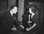 William Fonville, left, as District Attorney Galway, and Connie Randall, as Mary Dugan, are pictured as they appear in a scene in "The Trial of Mary Dugan," presented by Community Little Theater. Mr. Fonville is standing behind a desk, wearing a striped suit. Connie Randall is sitting in a chair on the other side of the desk, wearing a dress and hat.