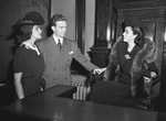 A scene from the Community Little Theater production of "The Trial of Mary Dugan," the theater's first production. Connie Randall, left, plays Mary Dugan, Frank Mills, center, plays Jimmy Dugan, and Mary Stone, right, plays Mrs. Edgar Rice. Mary Stone is sitting in a witness chair and is wearing a hat, dress and fur coat. Standing across from her, Connie Randall is wearing a hat and dress and Mr. Mills is wearing a striped suit.
