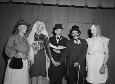 Five members of the South Fort Worth School Dads Club who will take part in a mock wedding ceremony in the school auditorium. Left to right, they are W. W. Doyle, bride's mother; Stanley S. Huckaby, the bride; E. W. Webb, the parson; W. C. Cantrell, the bridegroom, and M. F. Nelson, flower girl. C. A. Singleton, school principal, wrote the script for the wedding and directed it. Louis Zafran will perform magic tricks and orchestral music will be provided by W. B. Moore. Proceeds will go to the club activities fund. The club members are standing on a stage in front of a curtain, and the mock-bride and groom are holding hands. Mr. Doyle is wearing a blouse and a skirt. Mr. Huckaby is wearing a blouse, skirt, and a wedding veil and is holding a bouquet of flowers. Mr. Webb and Mr. Cantrell are wearing suits and top hats and Mr. Cantrell is holding a cane. Mr. Nelson is wearing a dress and a hair-bow.