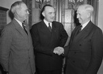The new president of Texas Christian University (TCU), Doctor M. E. Sadler, center, of Austin, Texas, shown as he received congratulations from Reverend L. D. Anderson, right, chairman of the committee which selected and recommended him to the trustees, and R. Houston Foster, left, president of the board, both of Fort Worth, Texas. All three men are standing in a room, wearing suits. Dr. Sadler and Rev. Anderson are shaking hands.