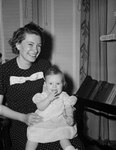 Mrs. Karl E. Pleger is holding her daughter, Penelope, who is sitting on her lap from Rochester, New York. They are guests with Dr. Pleger of her parents, Mr. and Mrs. B. C. Reich Jr, on Mistletoe Boulevard. The Plegers will leave Monday morning to return to their home in Rochester, New York. Mrs. Pleger is the former Miss Brunhilde Reich. Mrs. Pleger is wearing a dark dress with small, light colored polka dots and large bow across the chest, and ring on her right and left ring finger. Baby Penelope is wearing a light colored dress with small embroidered flowers along the front chest area and hem of the bottom of the collared dress, socks and shoes. In the background a book trough book case filled with hard cover books is on the right side of the family. On the left, in the background, a thin table with books and sculpted book end can be seen. A window covers by slated closed blinds and open curtains is directly behind the family. Published in the Fort Worth Star-Telegram morning edition, April 18, 1941.