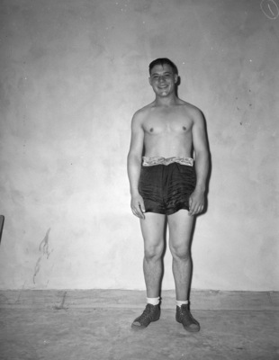 Amateur boxers competed in the Fort Worth district Golden Gloves tournament. The winners of the eight weight classes are moving on to the state tournament to be held at the Will Rogers Memorial Coliseum. Aubrey Martin is the winner of the heavyweight class. He is standing against a wall at the Recreation building, dressed in his boxing trunks.