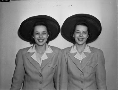 Lois Bailey, left, and Louise Bailey, who jointly hold the title of president of the Baylor University Twin Club. They are standing against a blank wall, wearing identical outfits consisting of a collard blouse, a coat and a wide-brimmed hat.