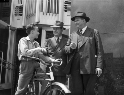 Frank Alderman (sitting on bicycle) with detectives E. E. Lockard, right, and Roy Hilts, center. These detectives were able to recover Frank's stolen bicycle.