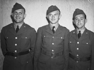 Some of the representative soldier athletes from the Camp Wolters Infantry Replacement Center in Mineral Wells, Texas are pictured. They are left to right, Emil Kaster, James Toth, and Robert Saunier. They standing against a wall, dressed in their military uniforms. Published in Fort Worth Star-Telegram, morning edition, April 20, 1941.